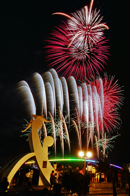 澎湖海上花火節施放地點是在觀音亭園區,煙火施放活動日期時間:從104年4月20日開始,美麗的煙火與得天獨厚的海灣環境、浪漫的西瀛虹橋相得益彰,由於煙火施放地點與觀眾觀賞區只有約300公尺距離獨特的臨場震撼感,為澎湖海上花火節最吸引人的地方~