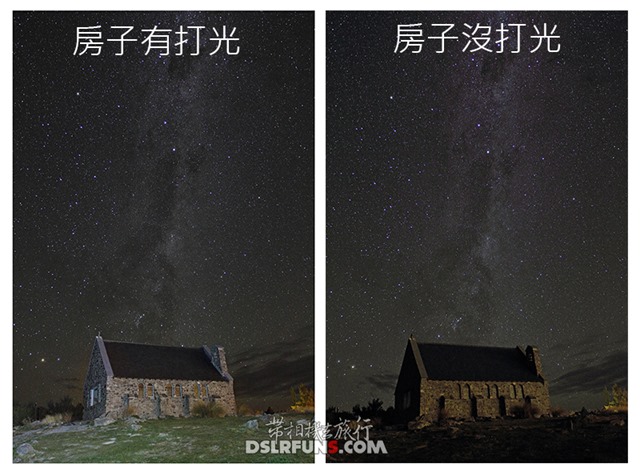按照上述原則,只要您能遇到好天氣,看的到銀河,要拍單純的拍銀河並不難。要連前景一起入鏡可以說是銀河照最大的挑戰,卻也是拍攝銀河樂趣的所在。前景太亮的話,可以搖黑卡。前景太暗時可以用人工補光,例如電筒、閃燈,打光盡量求平均,可以多試幾次找出最適合的打光方式。下圖是用手電筒在曝光時間內,慢慢將房子每一處都掃過一次而拍成的。