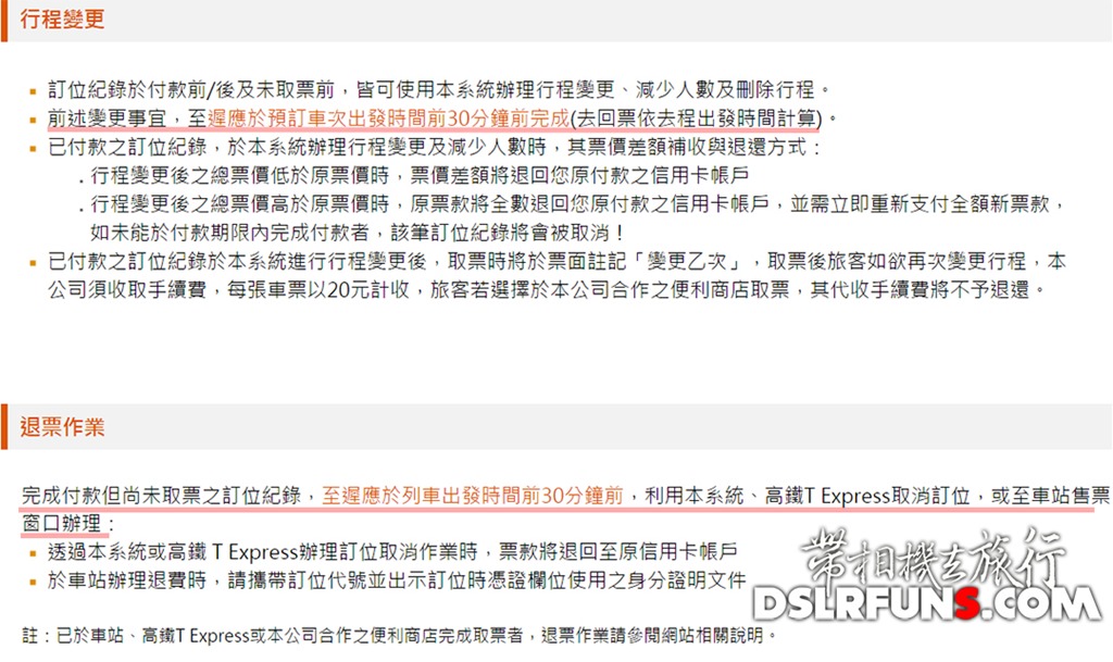 “請務必留意您的乘車時間並提前完成取票手續,倘因不及取票致無法搭乘所訂車次(遲到來不及取票搭乘)之情形發生,恕不受理退費及取消訂位。”